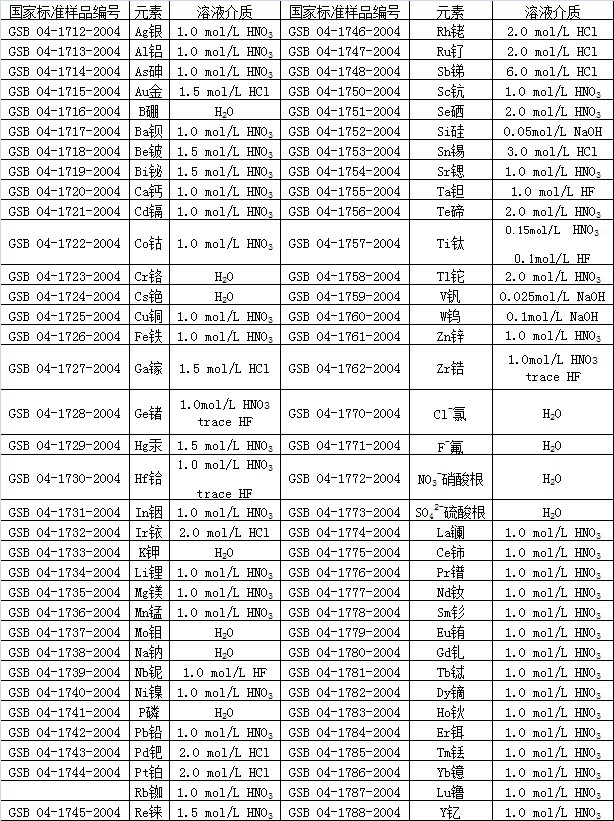 上面表格中所有产品包装均为50ml,所有单元素标准溶液的元素质量浓度均为1000μg/mL,如需其它规格请与本公司